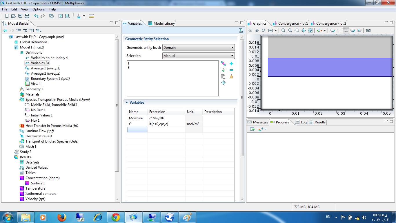 if(c1,1,c)) Dear Tero, First i would like to say thank you because ,i am doing my MS project "modeling of electrosorption" using comsol version 4.3 at Hindustan Unilever R&D,Bangalore and i got the same problem of getting negative values or larger values which are not expected.I searched for resolving this problem in various literatures and available comsol materials but i did not find anywhere and finally i found randomly here(discussion forum) and i tried it and its working well.But i have a few doubts about defining this condition. (1)How much small number is this eps? or is it constant small number? (2)what is the condition if c lies between 0 and 1 i.e (0=