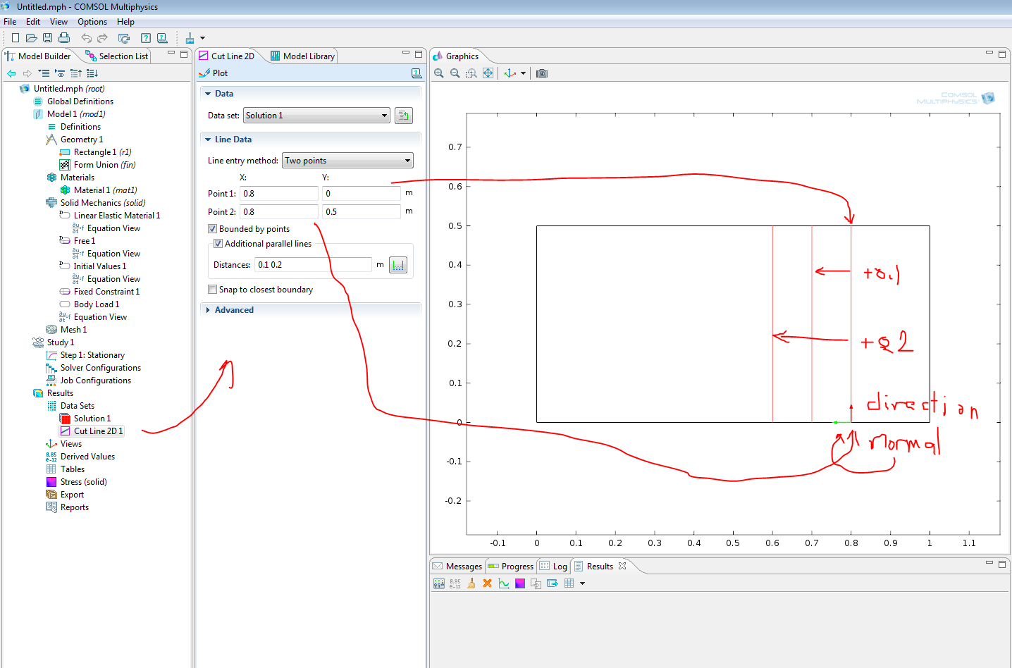 Hi, Just a small comment about the first line still at y = 0. That is the original cut line that you define as Point 1 (x = 0, y = 0) Point 2 (x = 0.02, y = 0) The additional parallel lines that you add do not replace the original cut line, just adds more parallel lines. Best regards, Magnus Ringh, COMSOL