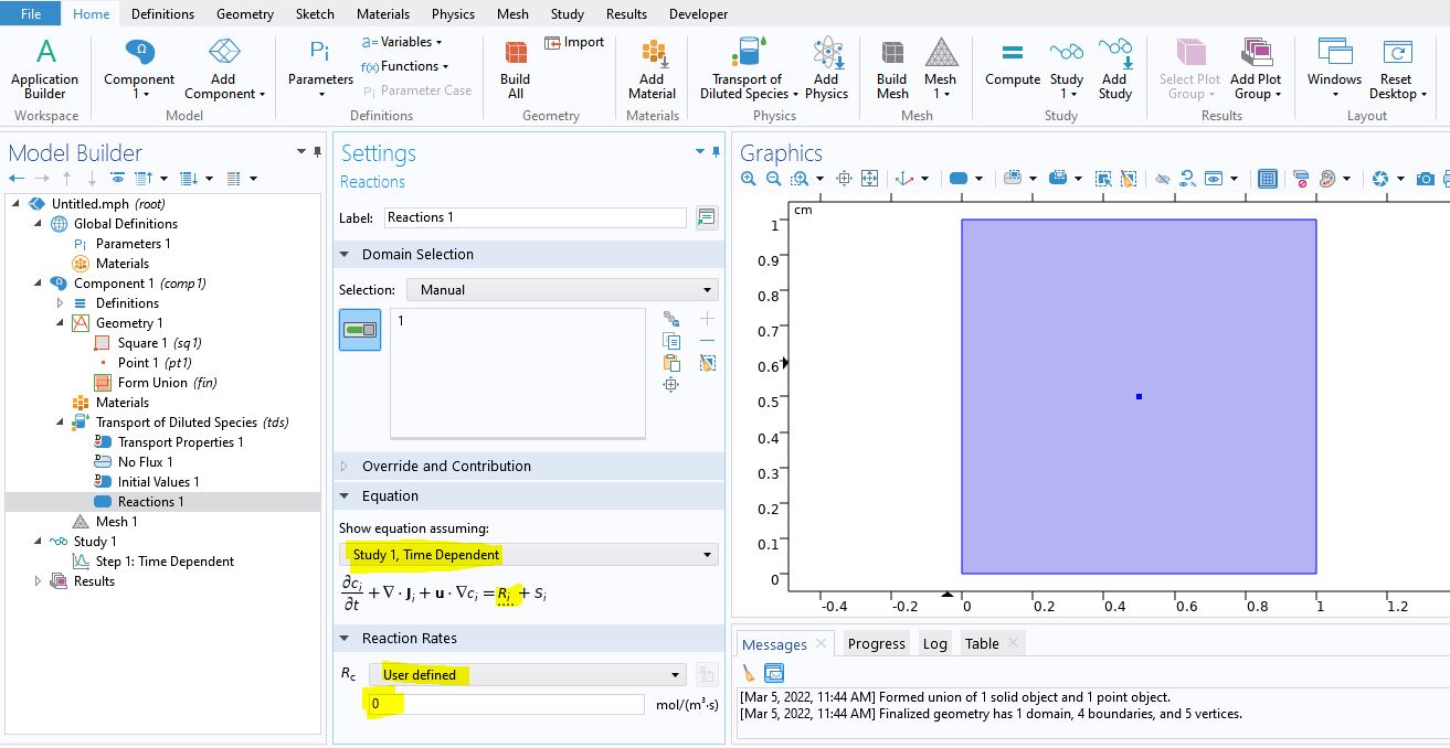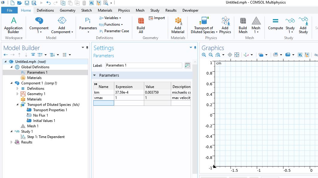 I am trying to model for 2d diffusion of pepsin with Michaelis menton chem kinetics using 'transport of diluted species' interface and 'time dependent' study (see image 3). I have defined the constants (vmax, km) in the 'global definititions parameters1' section to be used as part of the MM equation (see image 1). However when I add the 'reactions' option to the model, it only lets me input a single reaction rate Rc (see image 2). How can I can change this predefined equation to input the MM term - vmax x c / (km + c) and call the predefined constants from global definitions? I dont have access to the chemical engineering module on my current license, so hoping you can help. Thanks!