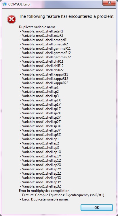 I am trying to use a PML with my model. The model uses solids and shells in the structural mechanics. The PML is around a solid block on five sides. However when I attempt to solve I get the error Duplicate variable names for a large list of shell variables (see attached). Can anyone tell me what I am doing wrong. Thanks.