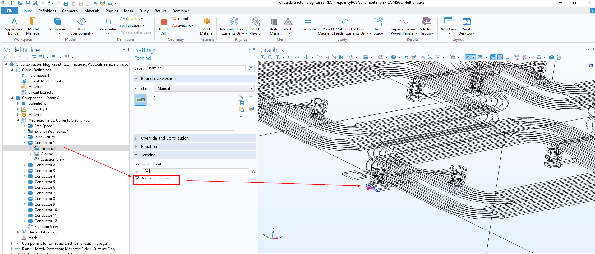 The depicted model is the "CircuitExtractor_blog_case3_RLC_FrequencyPCBCoils_reset.mph" from the following blog post: