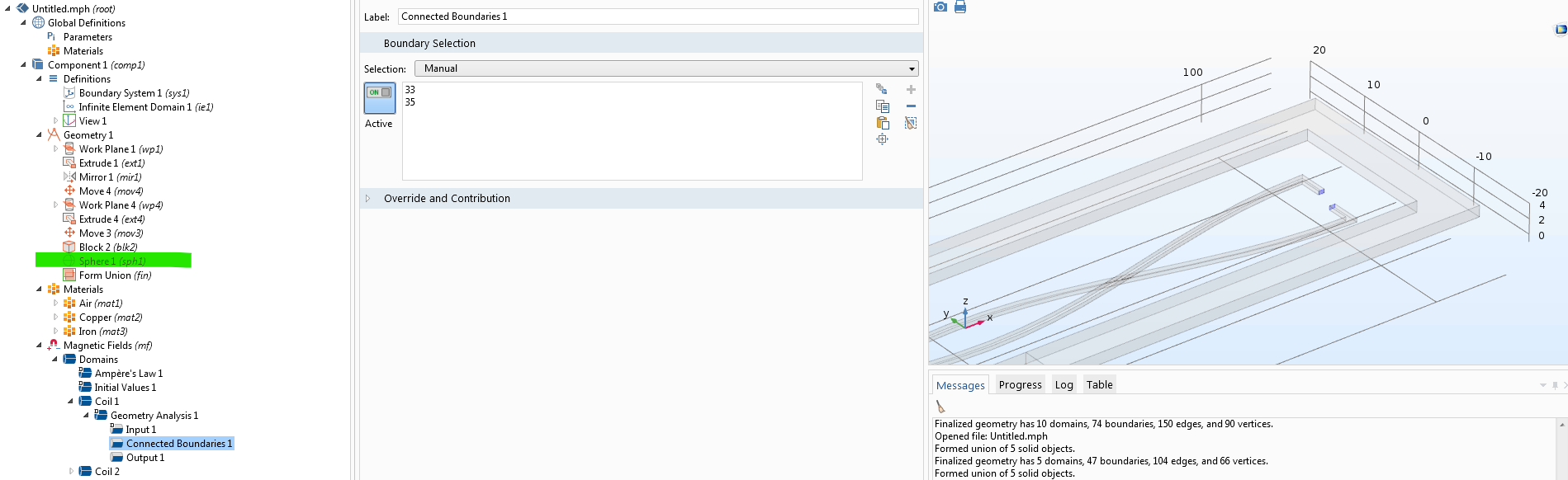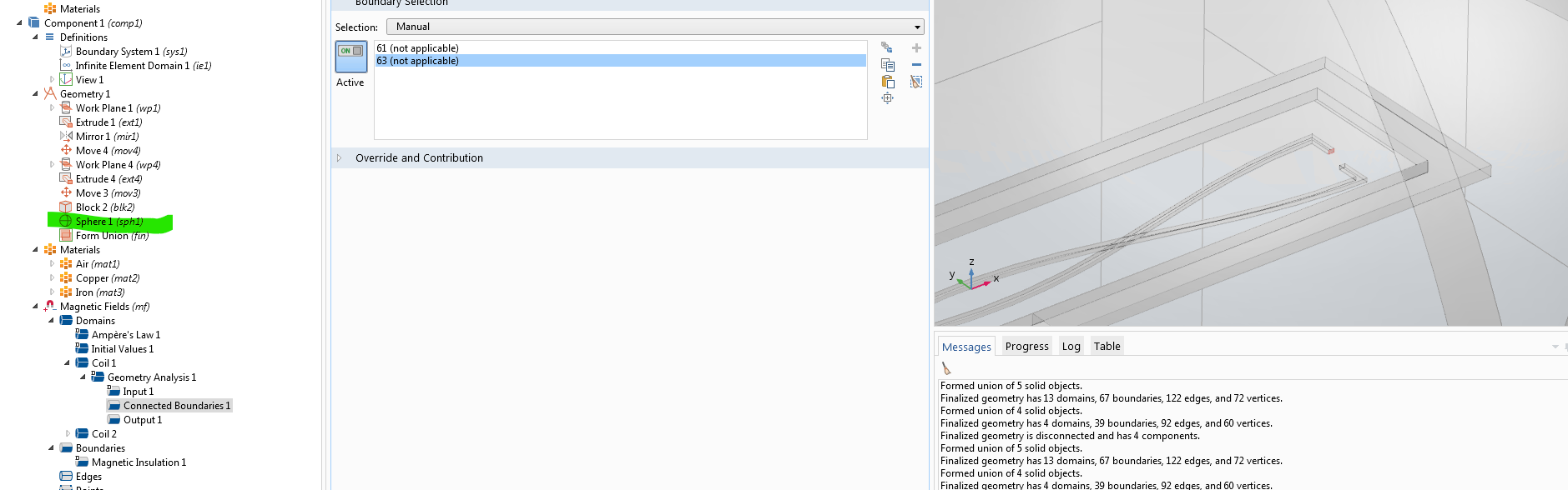 Now i'm trying to simulate a SIN/COS inductive RX track, with a TX coil around it. I made the 3D geometry of the SINCOS track within the comsol modeller, and I'm trying to connect the faces with a connected boundary under the geometry analysis. I currently only drew the cosine track, as I solve problems step by step.