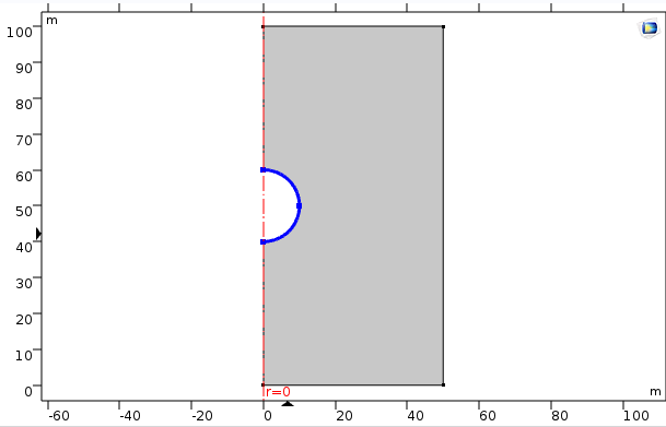 Create a 2D axisymmetric model in the COMSOL Model Builder, and define the geometry of the domain, including the hole.