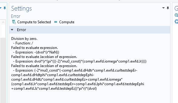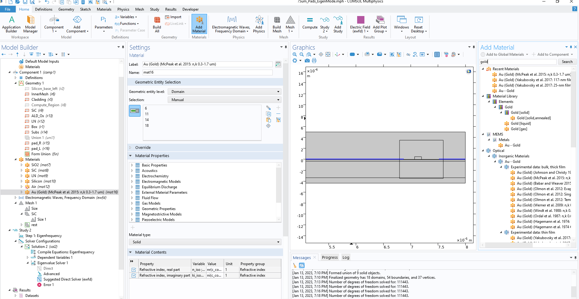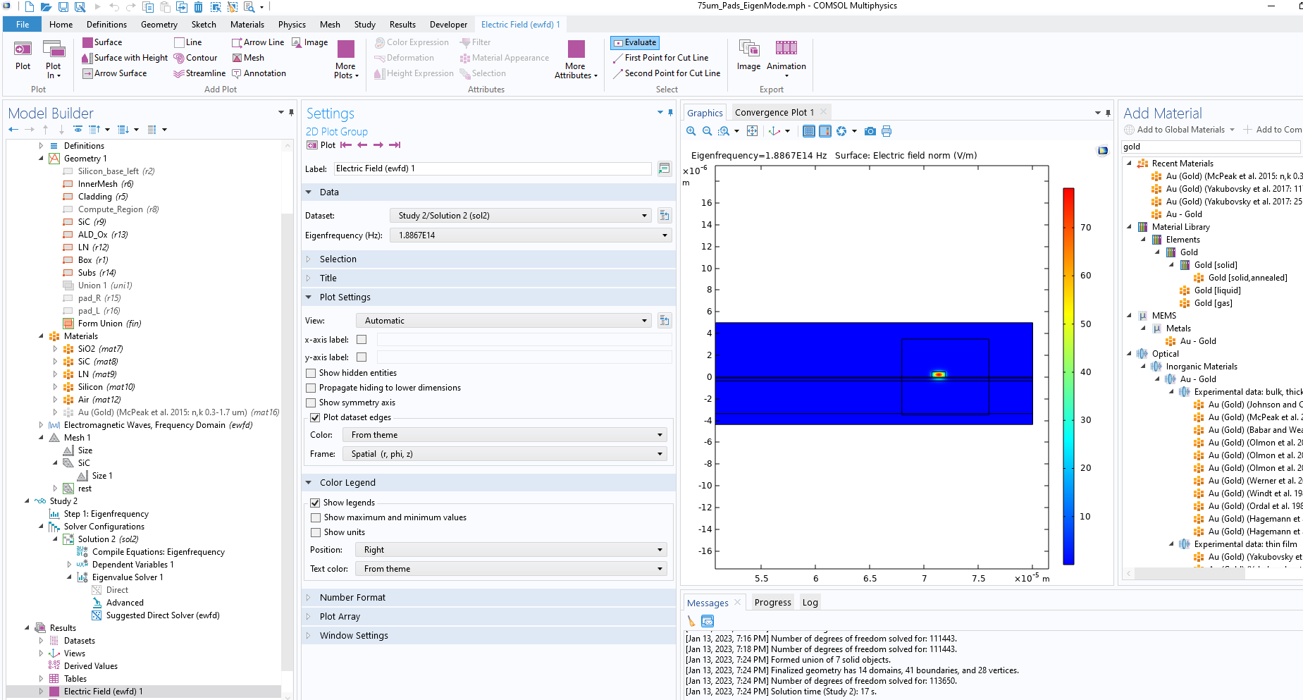 Hi, I am trying to simulate the loss effect on the optical mode of a ring resonator when metal electrodes are kept next to it. For this I built an axis symmetry model, with eigen frequency analysis study. My intention is to find the eigen frequencies and observe the imaginary part to get an estimate for the metal/electrode induec loss Now without the electrode material/metal pads, my simulation has been running fine producing the modes. Since my goal is to use Au/gold for electrodes, I used the gold material from the library of the materials available under "Optical-> Inorganic materials -> Au". With the introduction of this material to the simulation, I get the Jacobian error. Assuming that the thinking process is correct, what could be the cause for this error?