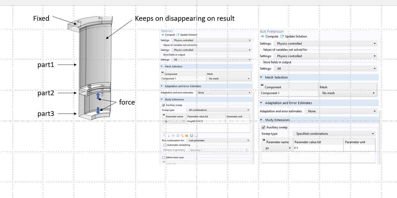 Part 1 does not show on my result. the only stress I can see is from bolts and bolt contact area. My expectation was to see stress from part 1 as well as part 3.
