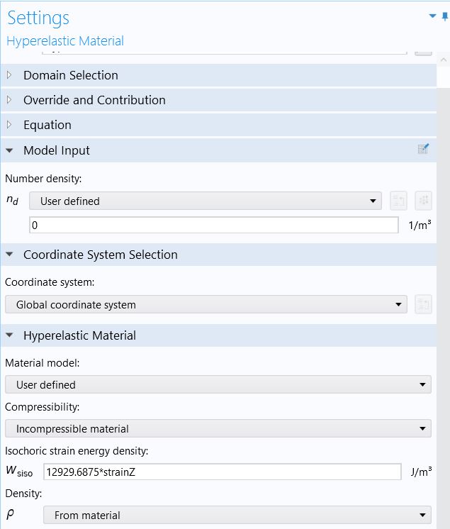 I filled the parameters mentioned in Hyperelastic material settings page, only W_siso in this case since I chose my material to be incompressible so there is no bulk modulus. Density is defined under Materials.