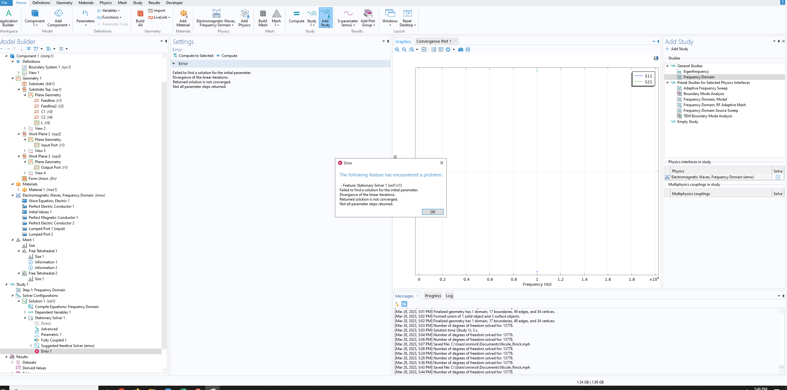 Your geometry still has some issues and your mesh could use some work too, to allow smoother variations of field quanties. You also aren't modeling any surrounding air, so that introduces additional errors in your computation. However, if your main concern is getting past the error message, then change the solver to "Direct" instead of the default iterative solver, and it will run to completion. If you fix all the other issues, you might even get the iterative solver to work, but the direct solver is more tolerant.