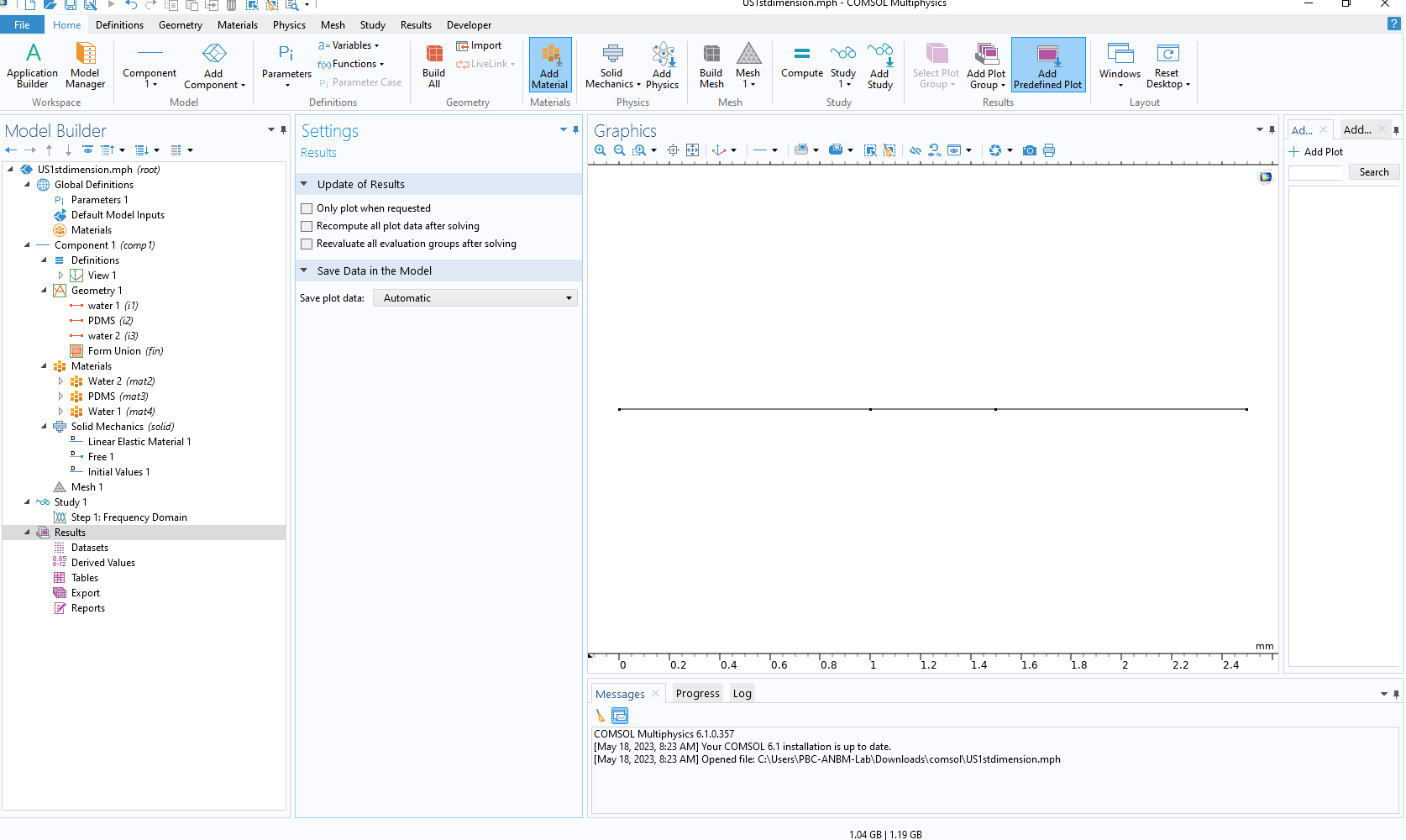 I had a question about working with comsol on 1 dimension. I am trying to create a stream of water to PDMS to water again which I have done shown below. However, in the beginning water I want to have an ultrasound wave of 1MHz to be imputed (left to right) but I am having trouble with that. I have tried going to physics and adding a boundary but it doesn't work. I saw it work in a video on Youtube but that's because their model was 2 dimensional, in which they used the inlet feature however the inlet feature isn't in the one dimensional model. How would I solve this? or would it only be possible to do this if i use a 2 dimensional model?