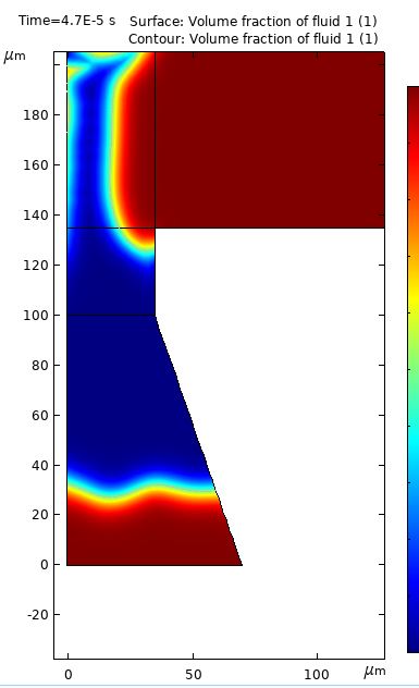 I am in the process of simulating an inkjet nozzle - Level set method simulation of an experimental 3D Printing nozzle. The input of the printer is given as triple pulse waveform. I have finalised the boundary conditions and input pulse as Pulse Voltage - (150, 120, 90) V , Pulse Length - (20,20,20)μs Pulse delay - (9,9,9)μs . Input velocity - 0.56[m/s] * rect1 t[1/s]. Time step (0,1e-8,1e-6) s. I have attached the results for your kind reference.
