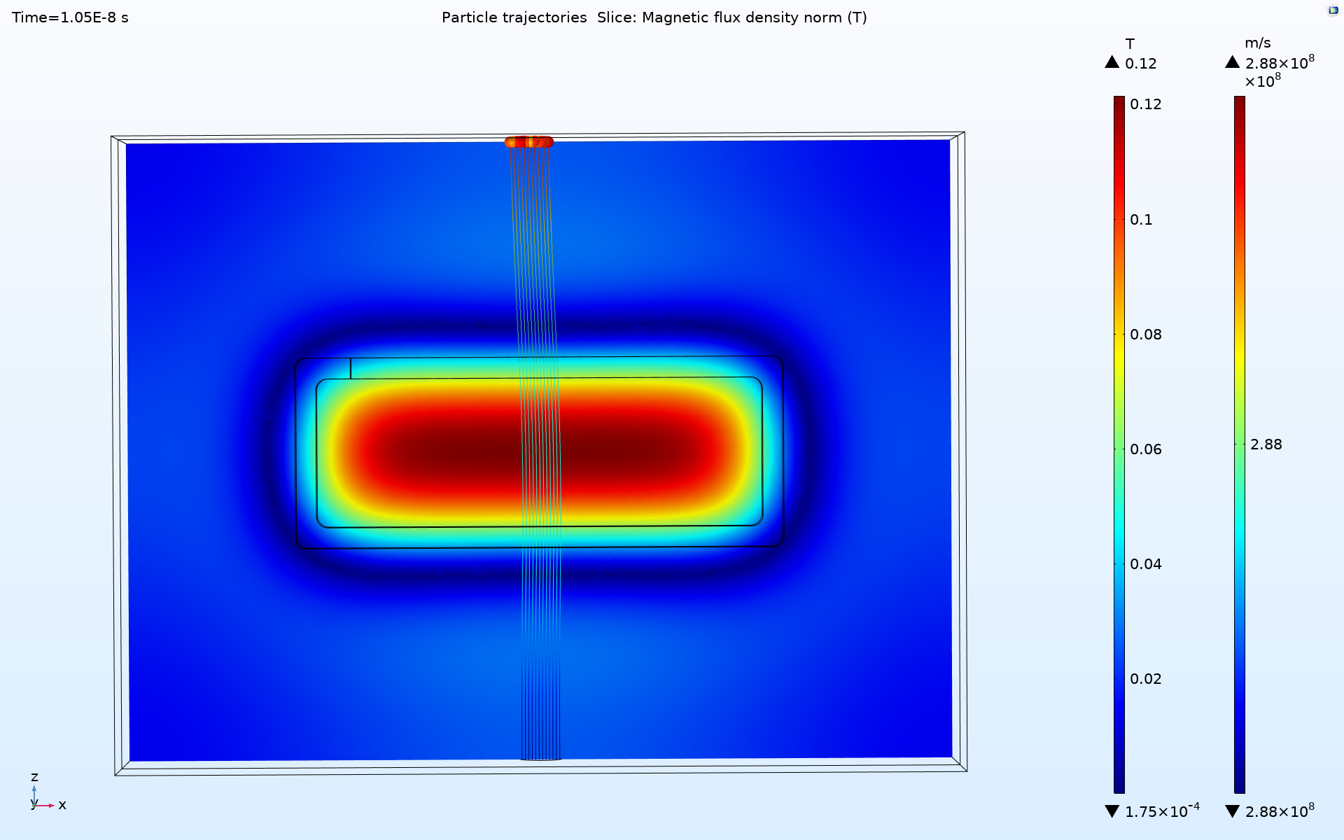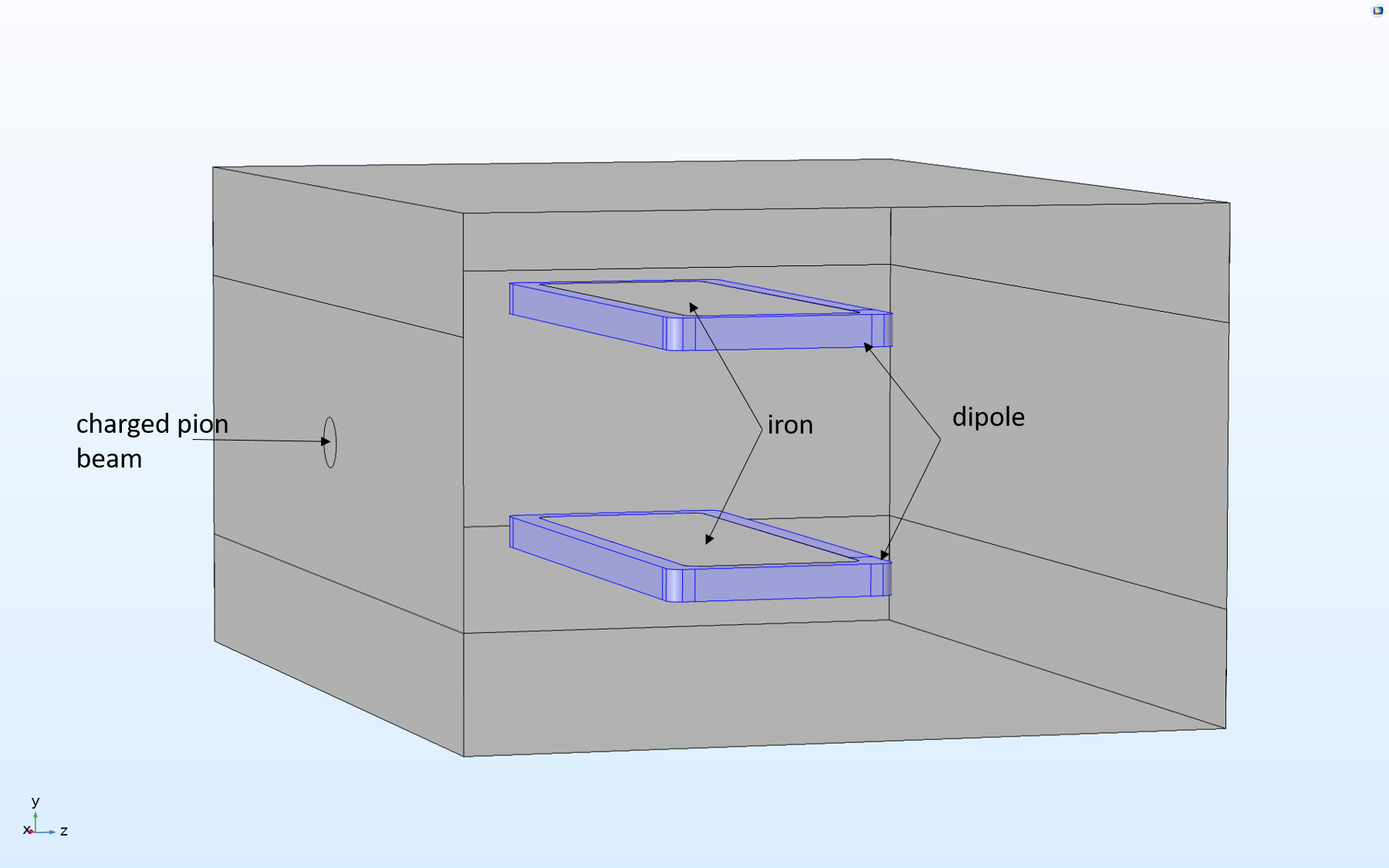 In the attached simplified 3D COMSOL model I am simulating a simple dipole magnet that is used to bend a beam of charged pions (produced at a stage up stream to the dipole magnet) of ~ 480 GeV/c momentum. The bent beam will be then directed to a focusing element (e.g. quadruple).