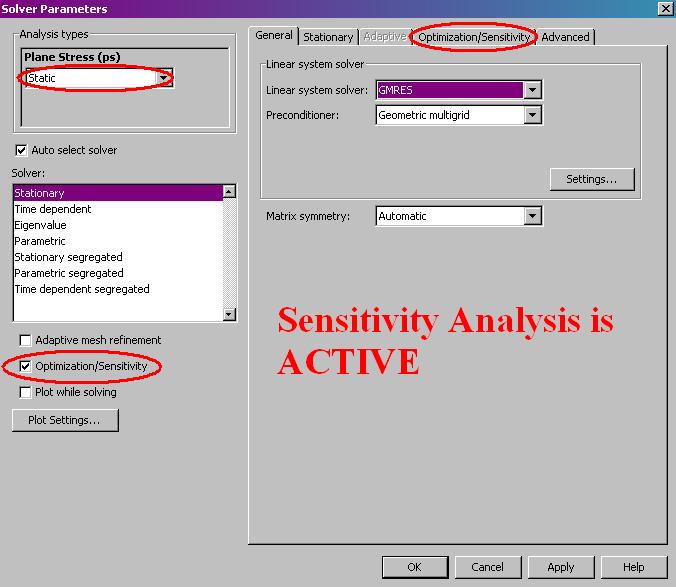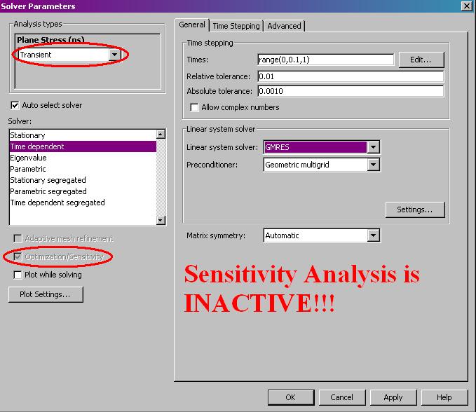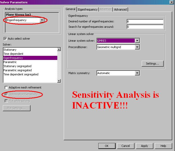 Basically, my problem is that when I choose one of the "time dependent" or "eigenfrequency" solvers in solver parameters, the "optimization" tab gets turned off. Therefore, I cannot arrange any setting for "sensitivity analysis" and hence cannot use "sensitivity analysis" in combination with "eigenfrequency" or "time dependent" solvers. Please see the attached pictures, which are some screenshots from solver parameters.