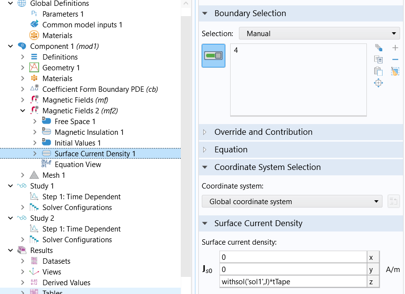 To do this I tried to impose the function "withsol('sol1',J)tTape" (tTape is a thickness) as visible in the figure but with this definition Comsol does not take into account the temporal variability of J; it is as if Comsol took J's solution in a single instant of time.
