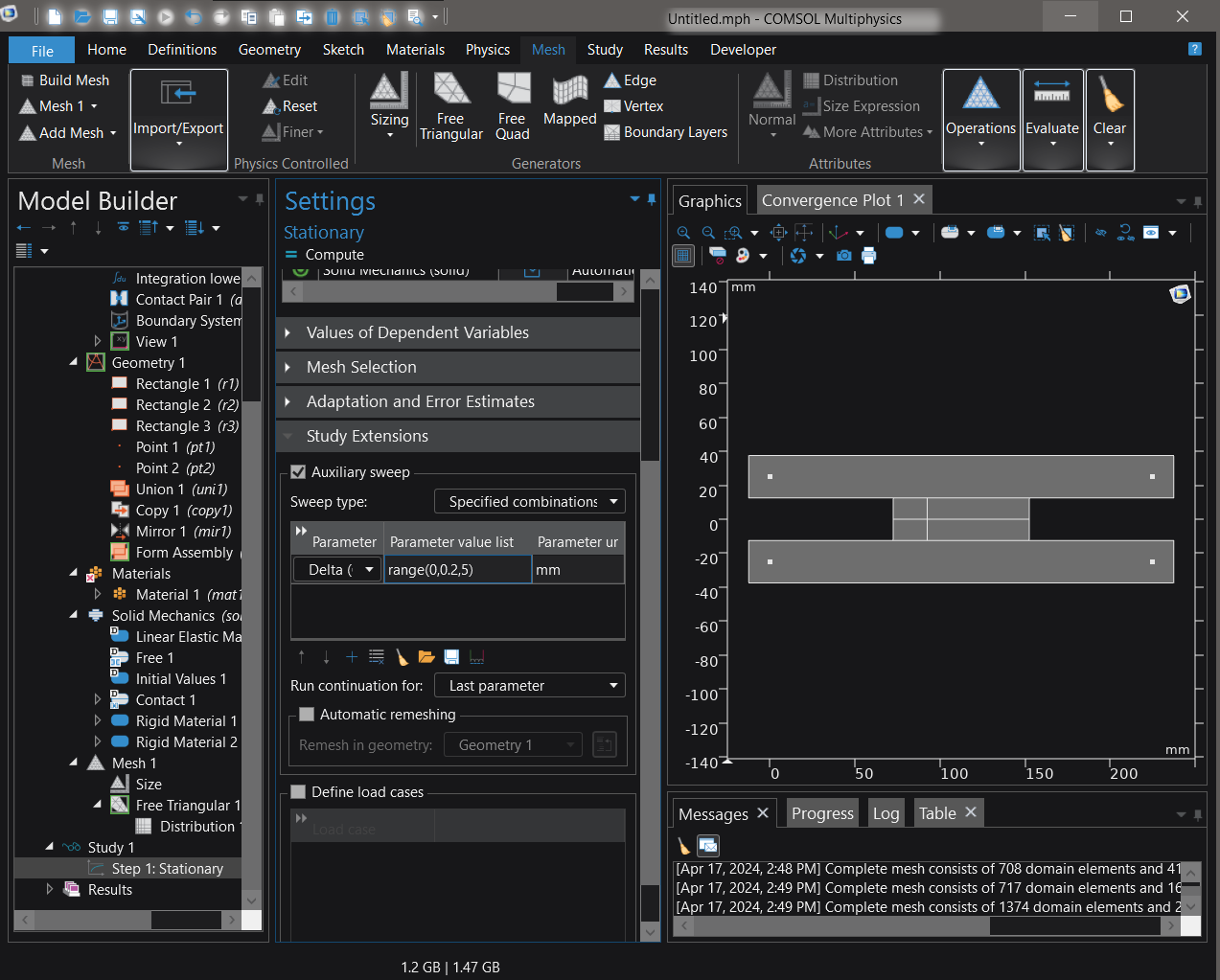 With regards to the load increment you can use the method used in bracket_parametric from https://www.comsol.com/model/bracket-8212-structural-mechanics-tutorials-10314