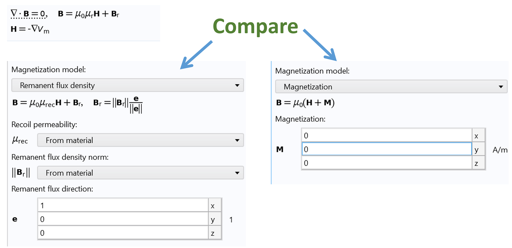 There is a difference. See the attached figure, showing screen shots of the equations, taken from the two different settings you mentioned. For a more detailed discussion of the physics, I recommend the text: "Permanent Magnet Materials and their Application" by Peter Campbell.