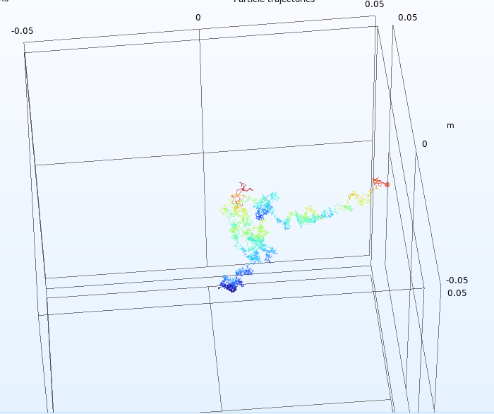 Hi, I'm simulating the trajectories of electrons drifting in Ar under an electric field. One single electron is released in the centre of a cube filled with argon. The electric field is applied by defining a potential on opposite sides of the cube with an electric field strength of about 400 V/cm. The static electric field is then calculated using the Electrostatics Node. The Charged Particle Tracing Node is using then this field to apply an electric force to the electron which is released without an initial velocity. I have turned on Elastic Collisions with specification of a collision cross section. The electron gets accelerated in the field and collides with the background gas atoms. However, the electron does not seem to just get accelerated by the field and then decelerated by the collisions. It gets scattered in a way that it even goes in the opposite direction of the electic force and then collides with the wall, not getting close to the anode. I've added a picture of one trajectory, the elctron should move to the front surface of the cube but gets scattered to the right where it collides with the wall. Is there anything to be considered in this simulation case for example linking the electric field to the Time Dependent Solver of the CPT in another way? It seems unrealistic, that the electron gets scattered this way and is this less affected by the electric field.