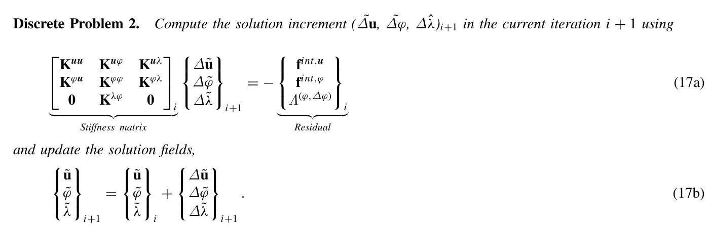 I'm currently working on a phase-field fracture problem and trying to implement a custom solver that follows a Newton-Raphson iteration scheme with arc-length control, similar to what is shown in the attached image (equation 17a and 17b).
