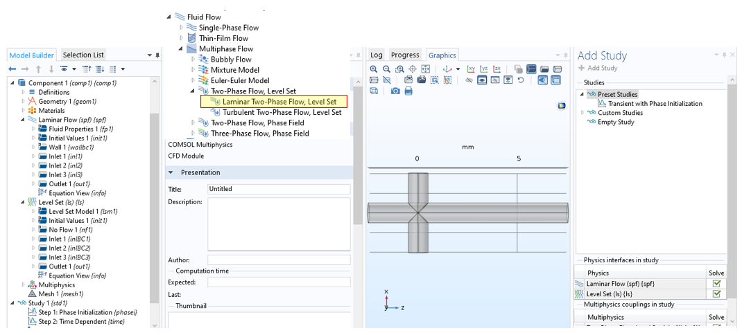 I am trying to simulate the emulsion between 2 immiscible liquids under Fluid flow > Multiphase flow > Two-phase flow, Level Set > Laminar Two-phase flow, Level Set. The geometry is a cross consisting of 3 inlets and 1 outlet (final geometry 1 object = 3 domains). The materials are ethyl acetate (1 domain = horizontal inlet) and water (2 domains = vertical inlets), defining the density and dynamic viscosity of both. Wall condition: no-slip. Mesh is physics-controlled-mesh with normal element size. Study is transient with phase initiation. Under the Laminar flow branch, I define the velocity of the inlets. Under the Level set branch, I define the Level set condition for each inlet: vertical inlets (fluid 1 and fluid 2 depending on the inlet). Under the Multiphysics > Two-phase flow Level Set branch, I define the surface tension coefficient (User defined)