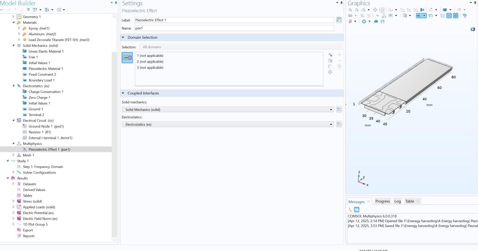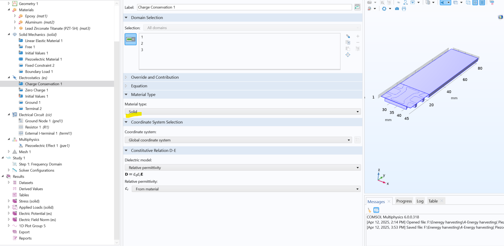 Hello everyone, I'm trying to simulate the piezoelectric energy harvesting with cantilever beam and when I check the multiphysics coupling says all the domains are not applicable as shown in the attached screen shoot. I have made the material type for the charge conservation as solid and still problematic, and results to have zero voltage generation, since I want to plot the frequency with voltage output. Would you please help me on fixing these problem?
