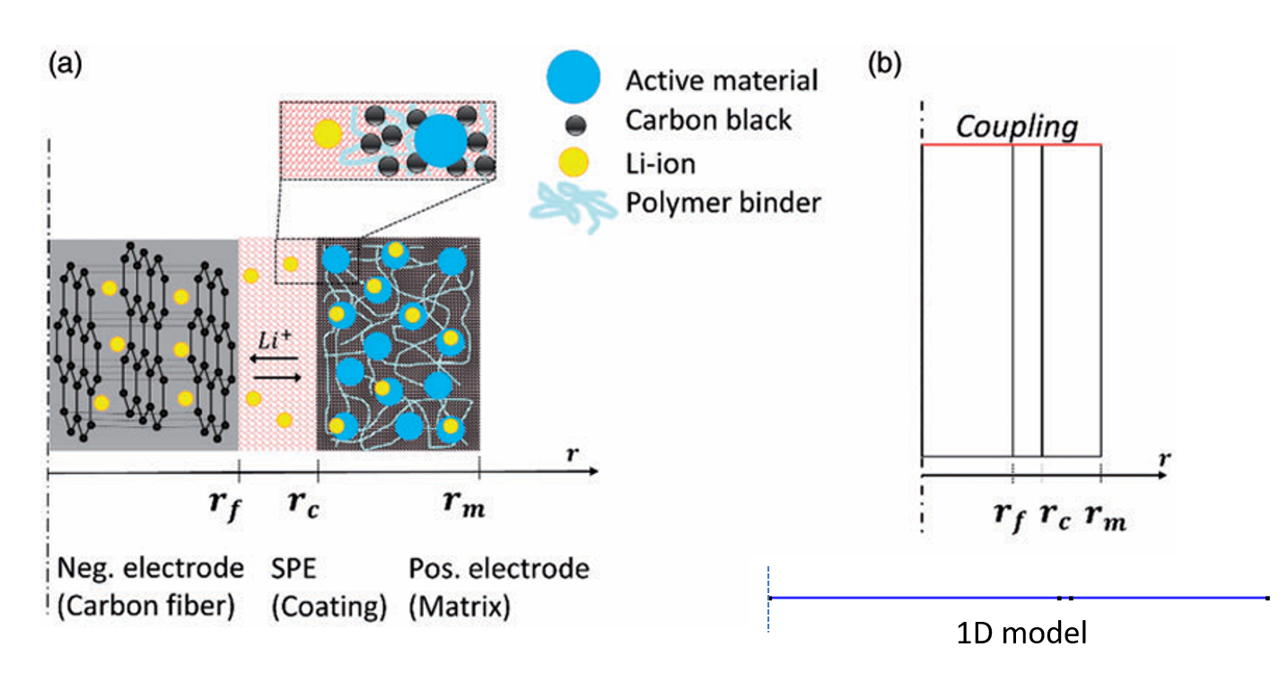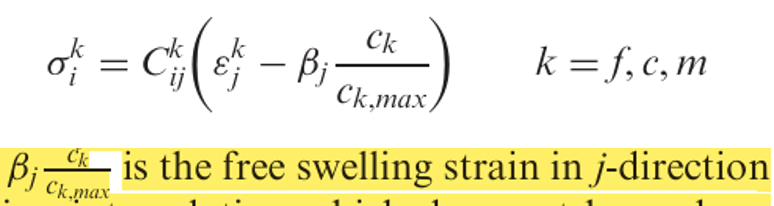 Hi everyone, I am trying to do a 1D simulation of induced stresses in the carbon fiber anode and LiFePO4 composite matrix cathode of a structural composite battery due to Li-ion intercalation/deintercalation using COMSOL. Carbon fiber acts as the negative electrode and is transversely isotropic. I have a value of intercalation-expansion coefficient B_j and each component's electrochemical and mechanical properties. I have not been able to solve the following points. 1. I have not been able to define transversely isotropic materials of carbon fiber anode. 2. I have not been able to assign swelling strain to the console. 3. I'm not able to couple lithium battery physics with solid mechanics.
