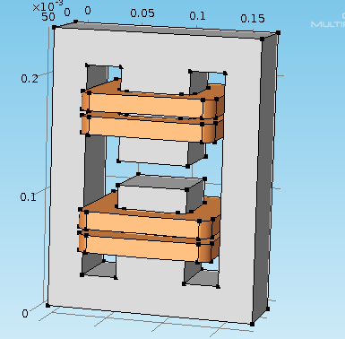 The four quadrangular structures are coils with a external current applied. I defined all the domain's material and added the multiturn coil domain system for each coil.