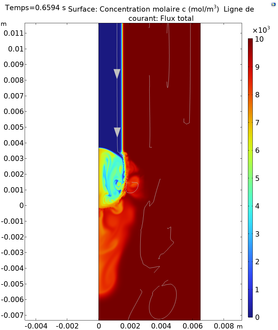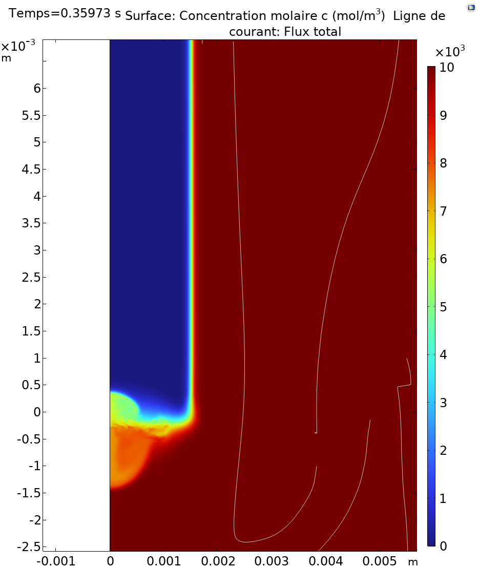 Hello everyone, I have developped a numerical model for the combustion of iron rods ignited at their base with a laser beam and placed in an oxygen atmosphere, for that i'm using the phase field method, the problem we are facing is that at the bottom of the sample, we should have a diffusion of oxygen in liquid iron, but also have a diffusion of iron inside the oxygen phase, since we are not modelling the transport of mass we shouldn't have that, the only way we are modelling the vapor is by a heat loss. The main problem is that this diffused metal below the sample is getting the oxygen away from the sample, thus reducing the oxygen incorporated in the liquid iron and the global reaction rate, can anyone tell me what is this diffused element ? how to get rid of it or make it so that it does not displace the oxygen below the sample ? Thanks in advance, i have attached below a picture of an oxygen concentration field.