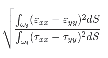 Hi Tarik, you have to define two integrals: go to Model>Definitions>Model Couplings>Integration. Do this two times (you have two integrals), so you get intop1 and intop2 that you define as surface integrals. Then set in Results>Derived Values>Global evaluation your equation, that is: sqrt(intop1((e_xx-e_yy)^2)/intop2((tau_xx-tau_yy)^2)). I hope this helps! Fabio