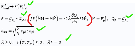Thank you for your message. I however did some hand calculations and I think the 6.0 documentation was correct (in multiplicative plasticity, the flow rule is written in terms of Kirchhoff stress). I can derive the equation written in COMSOL's equations page from that, please see the bracketed term in the attached screenshot image(4). If I use the equation from 6.2, I do not obtain the Jacobian J, in the beginning of the equation. Could you please elaborate or point me towards the correct reference it was taken from?