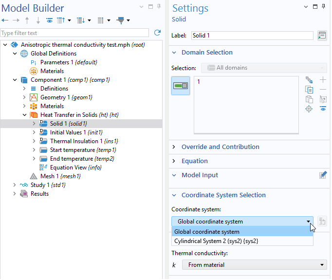 I wanted to do something similar, but for thermal conductivity instead of thermal expansion coefficient. A cylindrical coordinate system under definitions in the component has been added. However, I can't find any option to change the coordinate system in the materials model. See the attached file for a simple test file. Does the option to change the coordinate system exist, and if so, where?