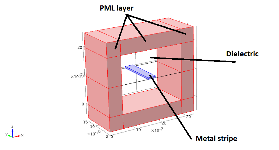 To do this I have created a simple 2-port structure - the metallic stripe embedded in homogeneous dielectric of 1um thickness from each side (see the attached picture, blue is the waveguide, red is PLM layer). The waveguide is terminated by 2 ports at each transverse cross cuts.
