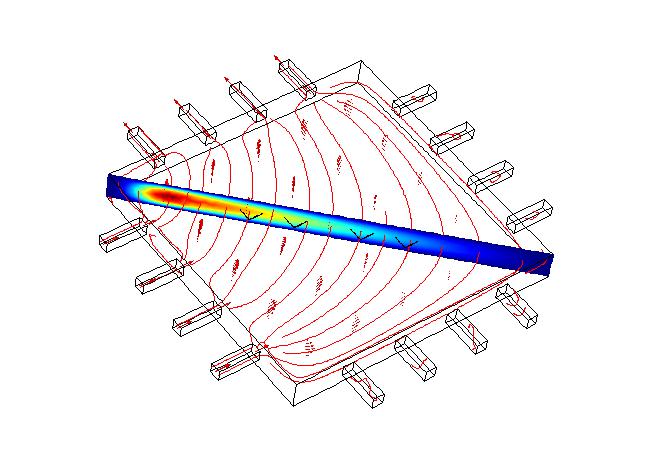 Anyway, after delving into basics of Fluid Mechanics I realized that fluid velocity would hardly depend on the viscosity of the fluid for a given flow rate and geometry. My model is pretty simple: Its a chamber of 20 x 20 x 2 mm^3 dimensions connected to 4 channels of hydraulic diameter of 0.8 mm on all four sides. I am simulating 90 degree flow configuration. Please find the image attached for better understanding.