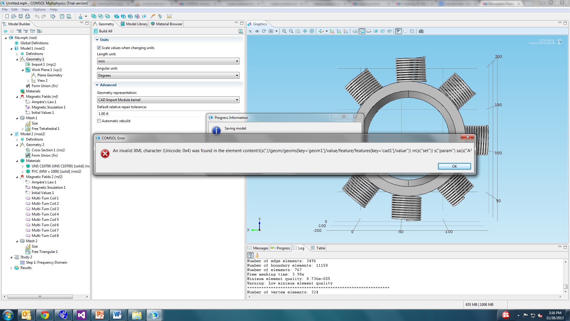 1. I am unable to save my model. I have imported an assembly from solidworks into comsol and when I try to save I get the error " An invalid XML character (Unicode 0x4) was found in the element content: t(s("//geom/geoms[key='geom1']/value/feature/features[key='cad1']/value)) m(s("set")) s("param") sa(s..."