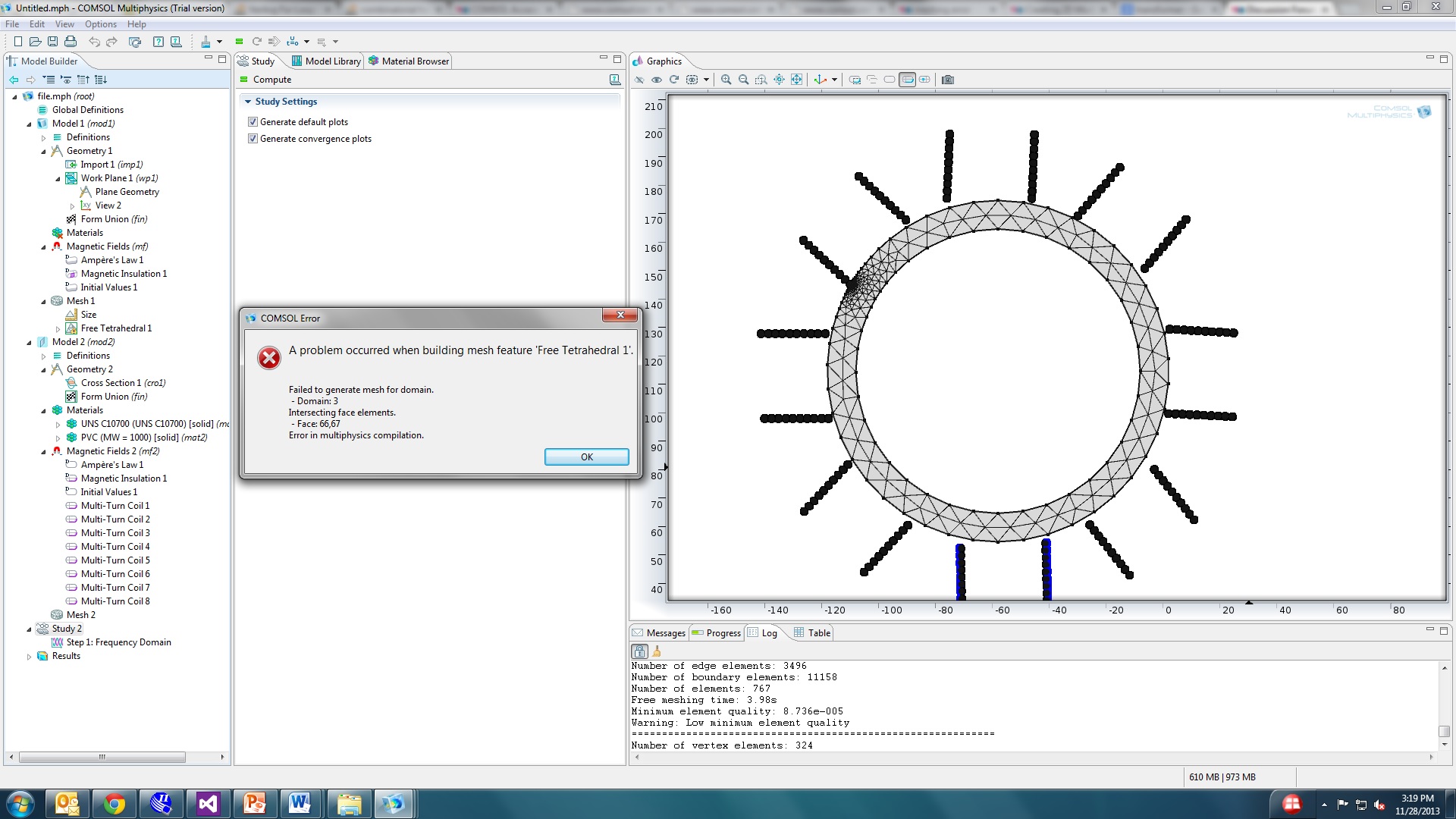 2. I have created a cross-section of the 3-d image I have imported, and I was trying to compute my physics but i get a meshing error, about intersecting faces. I can generate the mesh by clicking 'build all' in the mesh section of the model., but not compute the solution.