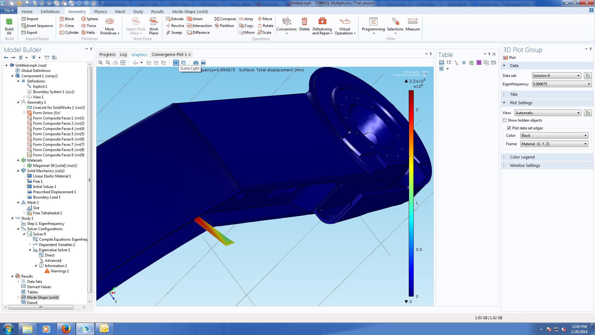 I am trying to run a vibration analysis on a part. I used the Solid mechanics module and the Eigenfrequency study. I specified the boundary condition, the loading and the material. But when i compute the study, two things occur. Firstly, some of the computed eigenfrequencies are imaginary, like 3.78i.What does that mean? Secondly the mode shape plot is completely confusing. I am attaching a screenshot for reference, as the model is a bit too large( 26MB). How do i get it it to work?