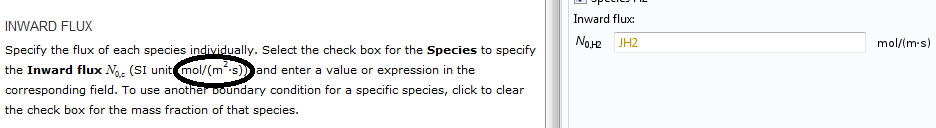 However, COMSOL only accepts a flux of (mol/m s), which is illogical, considering that flux terms are in (mol/m^2 s). Moreover, the help file itself suggests that the units are supposed to be in (mol/m^2 s). Attached is a screenshot.