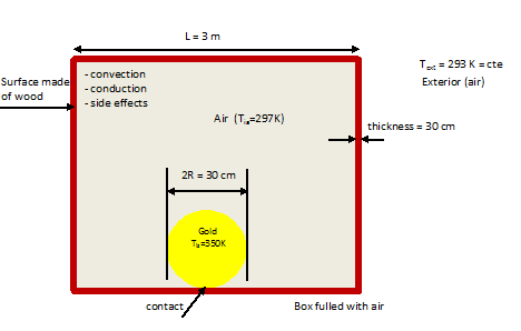 Let us suppose that a sphere (radius R) made of gold is located on a infinite surface made of wood. The system is enclosed in a box (length L) filled with air with a finite size. The sphere is very smaller than the dimensions of the box (L = 20 R).