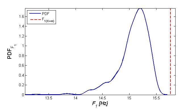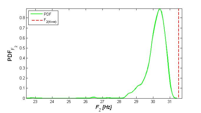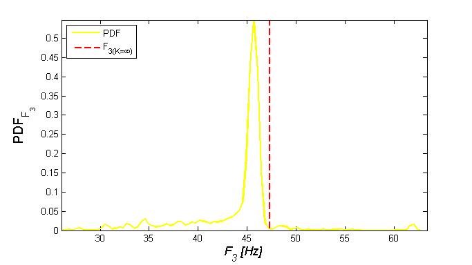 Everything worked fine for the first two frequencies but I had some trouble with the third one. The thing is that for some values of K, the magnitude of the calculated third frequency is higher than the one corresponding to a cable fixed at its ends (K=infinity). To illustrate this I attach PDFs of F1, F2 and F3 constructed with the data obtained. Note that in the graphs corresponding to the first and second frequency, the vertical line is never exceeded, whereas in the plot correponding to the third is.