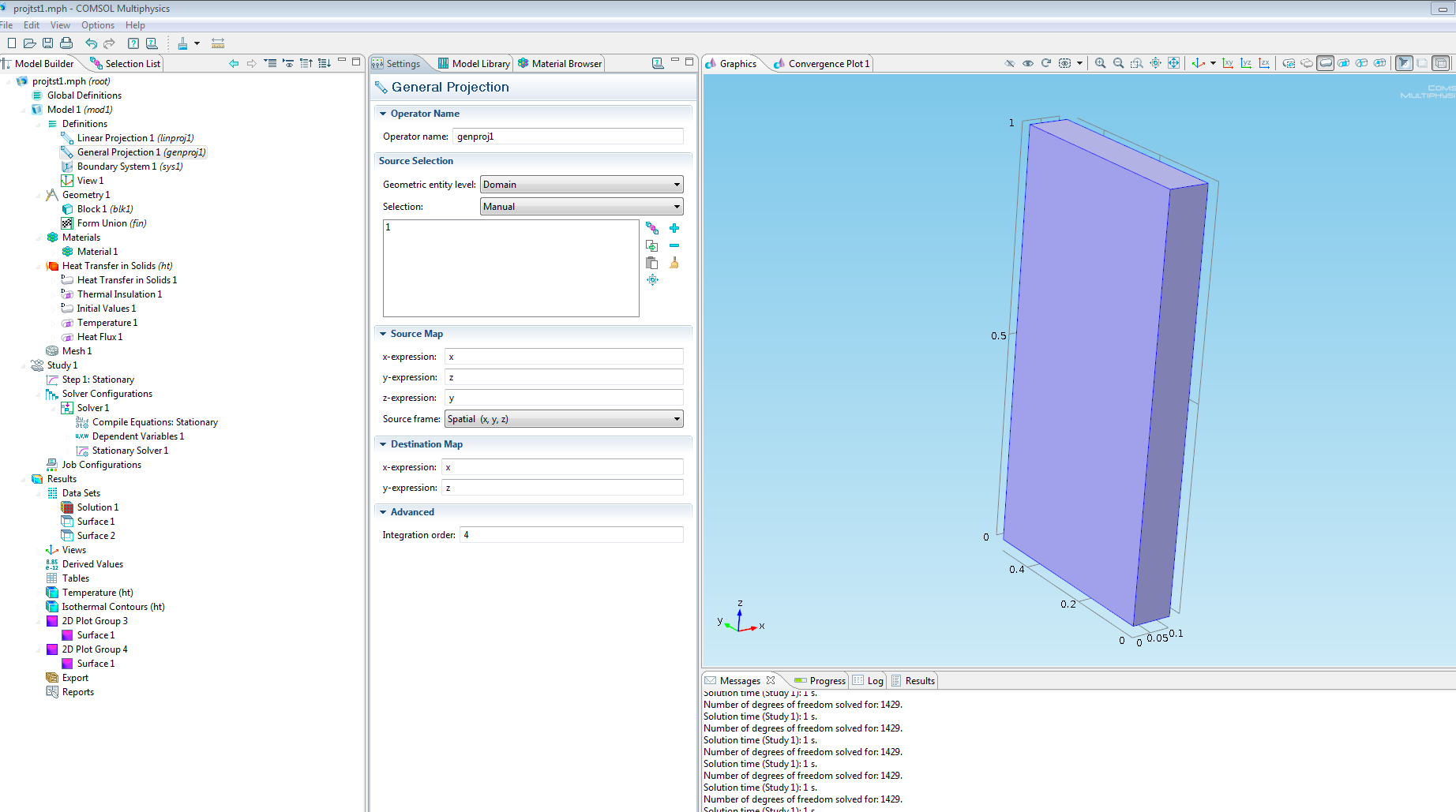 To translate a variable, say T, from geometry A (1D) to geometry B (2D), I believe the linear extrusion must be created under the definitions for the model containing geometry A. The destination is then set to geometry B with the selected boundary. Once the verticies are matched up appropriately, the linear extrusion operator should be called with the variable T as an argument - linex1(T) - for example. If this is true, where does this calling of the extrusion function occur? If it occurs in geometry B, the error "Unknown Function" appears because the linear extrusion operator is not defined in this model. If a variable is set to the extrusion value, like T1 = linex1(T), and this new variable is called in geometry B, the error "Unknown Variable" appears.