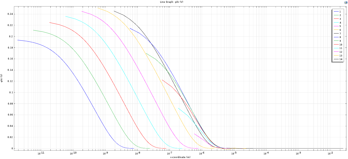 I expect to see a 59 mV shift at the surface of the insulator per pH. When I plot the surface potential Vs pH in MATLAB, I do get the 59 mV per pH slope. When I plot the surface potential Vs distance from insulator in COMSOL I don't get 59 mV per pH shift (plot attached).