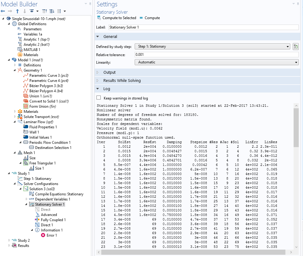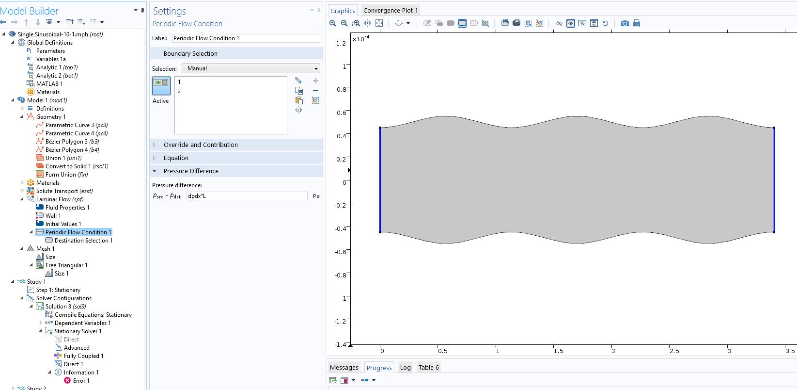 Hi Jeff, Thank you so much for the answering. I attach three pictures which you can have a closer look at the problem I am encountering. Picture 1 shows the model and periodic flow boundary, and Picture 2 shows the Solver Configuration where you can see, I just adopt the default settings and the relative tolerance is 0.001. Picture 3 shows the Converge plot, as you can see the Error is really tiny. But I do not know why the calculation is not stopped when the Error is below 0.001. I am trying to upload the mph file, so you can see it directly.