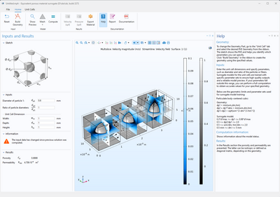 多孔材料通常以周期性排列的微观结构来表征。在计算多孔介质流动时,可以使用宏观尺度的渗透率和孔隙率,这些参数能够通过微观尺度基本单元中的蠕动流结果进行计算。本 App 提供了多种微观结构,用户可以调整其尺寸特征;随后,还可以计算并导出孔隙率和渗透率的等效值。