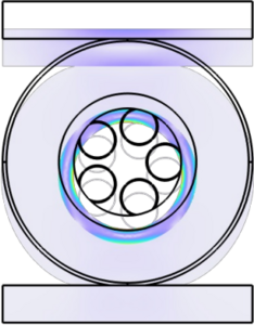 反谐振空芯光纤通过其包层中精心设计的微结构空腔,将光限制在空气纤芯中传播。与实芯光纤相比,反谐振空芯光纤具有极低延迟、超低损耗、和低非线性系数等优势,这些优势在高功率激光传输、长距离通信等方面具有至关重要的作用。尽管优势突出,但空芯光纤目前仍面临一些固有的缺点和工程挑战。 反谐振空芯光纤复杂的微结构可能使其在抗拉、抗压等机械性能上略逊于实芯玻璃光纤。在实际使用中,往往会受到弯曲敏感性和压力敏感性等因素制约。因此需要使用COMSOL Multiphysics软件进行仿真。 为此,使用了结构力学模块仿真了在受力状态下光纤的形状。仿真结果表明,光纤在涂敷层中发生了微小的形变,导致看损耗的增加。为了进一步了解微弯损耗的产生机理,利用波动光学对弯曲的光纤进行了仿真,发现光从原本的掠入射光纤内壁,变为斜入射,导致了光纤损耗的增加。