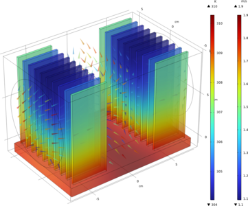 通过 COMSOL Multiphysics 的 CFD 模块,分别对两种风扇装配方案进行了稳态热流体仿真。在“同侧同向吹风”配置中,两个风扇均安装在散热塔的同一侧,将冷空气同时推向鳍片,模拟了传统串联风扇的模式。而在“两侧对向吹风”配置中,两个风扇则分别安装在两个散热塔的外侧,并向中间对向吹风,创造了一个在双塔之间形成高压区域的独特流场。仿真结果清晰地揭示了两种风扇布局的显著差异。
