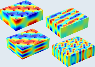 仿真结果与半解析计算吻合良好,并可解释对应的实验结果。通过对模拟结果的分析,我们能够对不同色散曲线的特性进行分类并详细描述。另外,我们利用COMSOL可以仿真各种几何结构的特性,将其拓展到磁子晶体能带的仿真计算中。