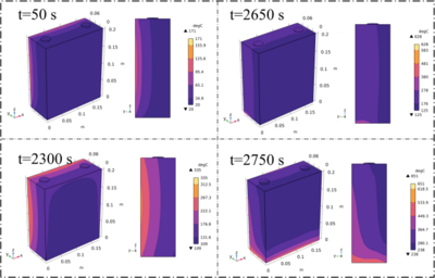 随着目前储能系统市场需求,电芯容量尺寸大型化已成趋势,与此同时研究电池内部热失控特征十分重要。在本研究中,通过COMSOL固体传热模块,建立细化的热失控单体模型来研究电池内部热失控特征,并且提出了触发能量作为不同热滥用工况下评价锂离子电池热安全性的重要指标,随后基于建立并验证的模型研究电池设计参数电池厚度以及卷芯数对热失控行为的影响。在COMSOL几何中,详细构建电芯铝制外壳及内部空气域,很好的验证了由于空气热扩散系数小于电池材料而导致的传热速度不一致现象。仿真的结果表明双卷芯的大容量电池热失控内部传递过程可分为四个特征阶段,仅增加卷芯数或减小电池厚度均会加速电池内部热失控传递大幅减小热量传递时间,但对电池特征温度影响较小。针对本研究对象280Ah方型磷酸铁锂电池,最小热失控触发能量为670kJ,占电池理论能量的20.8%,且电池内部能量约34.5%在热失控前释放,电池温度触发电池热失控后迅速释放约65.5%的能量。触发能量的概念可以为电池热失控及其传播机制及建模研究提供除特征温度外的新思路。