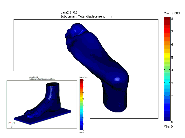 Understanding the stress-strain behavior of human foot tissues and pressure map distributions at the plantar interface is of interest into biomechanical investigations. In particular, monitoring plantar pressure maps is crucial to establishing the perceived human comfort of shoe insoles. A 3D anatomical detailed FE human foot model was created, starting from CT (Computer Tomography) scans of a 29 years old male. Anatomical domains related to bones and soft tissues were generated, using segmentation techniques, and then processed into a CAD environment to model 3D domains by using loft/sweep and boolean operations. Finally, FE model was generated into COMSOL Multiphysics, by assigning contact pairs and defining non-linear material laws. Particular attention was posed on fine tuning the calculation strongly dependent on the convergence parameters influenced by the contacts and hyper-elastic material properties.