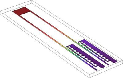 我们设计了具有梳齿结构的 MEMS 模型,并在 COMSOL Multiphysics 中利用结构力学模块与 AC/DC 模块针对应变场调控进行多物理场耦合仿真(图1)。通过施加电压控制梳齿间的静电力,使器件产生应变场。由于结构复杂,直接解析计算较为困难,因此采用载荷递增法模拟不同电压下的应变分布。仿真结果表明,当电压达到约 200 V 时,梳齿结构产生约 2 μm 的位移(图2),验证了电压调控应变场的可行性,并为后续的热学特性研究奠定基础。