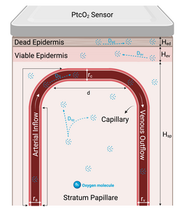 Accurate, real-time measurement of arterial oxygen partial pressure (PaO₂) is essential for managing respiratory diseases and critical care conditions. Traditional arterial blood sampling for PaO₂ is invasive, painful, and provides intermittent snapshots rather than continuous monitoring [1]. Transcutaneous oxygen partial pressure (PtcO₂) monitoring offers a promising, non-invasive alternative currently employed clinically as an indirect measure, typically interpreted within a reference range rather than as an absolute value. However, reliance on PtcO₂ alone has significant limitations, including physiological variability, skin temperature sensitivity, and environmental influences, thereby limiting its standalone clinical utility [2]. Precisely correlating PtcO₂ measurements with PaO₂ is thus critical for enhancing the clinical accuracy and utility of transcutaneous oxygen monitoring devices. This study introduces a detailed computational modeling approach using COMSOL Multiphysics software to simulate oxygen transport from arterial blood through multilayered skin structures. Inspired by Grossmann’s microcirculatory capillary loop model [3], our finite element model (FEM) characterizes oxygen transport through three distinct skin layers: the dead epidermis, viable epidermis, and the vascular-rich stratum papillare. COMSOL’s Laminar Flow module was utilized to simulate blood flow within capillaries, while the Transport of Diluted Species module addressed oxygen diffusion through tissue layers, incorporating physiological phenomena such as nonlinear oxygen-hemoglobin dissociation, metabolic oxygen consumption, and temperature-dependent variations. Simulations systematically examined physiological responses under conditions of blood flow occlusion and oxygen inflow variations, reflecting clinical scenarios like hypotension and hypoxia. Results demonstrated how simulated variations in PtcO₂ levels can be effectively correlated with PaO₂ changes, enhancing the clinical utility of PtcO₂ as a reliable parameter for respiratory monitoring. Furthermore, simulations incorporating personalized variations—such as changes in skin thickness and oxygen diffusion coefficients—demonstrated significant sensitivity to these parameters, highlighting the model’s capacity for individualized respiratory monitoring. Our computational approach validates the effectiveness of COMSOL Multiphysics in accurately modeling the complex dynamics of transcutaneous oxygen measurement. By establishing robust correlations between simulated PtcO₂ and clinically observed PaO₂, the model supports enhanced accuracy and clinical relevance of wearable monitoring devices. Future integration of additional personalized physiological parameters—like metabolic rates, skin permeability, hydration, and localized temperature conditions—promises significant advancements in personalized respiratory monitoring, ultimately improving patient outcomes in clinical and home-care settings.