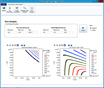 仿真 App 显示了水流分数(左)和渗入网内(右)的油通量如何随网眼半径和水深而变化。